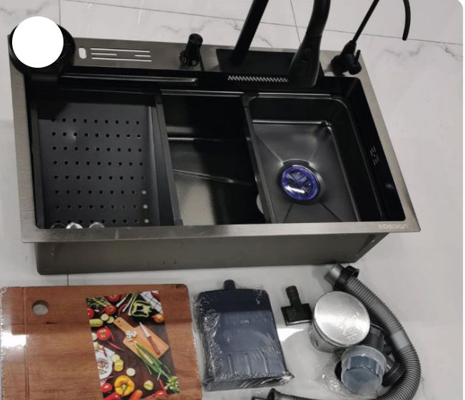 سینک ظرفشویی آبشاری تمام اتومات پنج کلید رنگ استیل دودی نصب توکار نمایشگر دیجیتال کنترل دمای آب استیل نگیر 304 ضد خش پوست ماری ضخامت استیل پنل 3میلی متر ضخامت کفی 1.3 میلی متر ابعاد 48 در 75 عمق 26